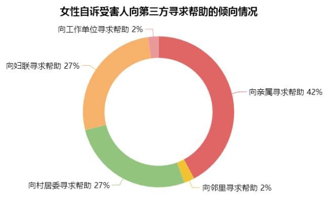 超过4成女性自诉受害人倾向于向亲属寻求帮助。同时,也有将近3成的女性自诉受害人倾向于向村居委以及妇联寻求帮助。