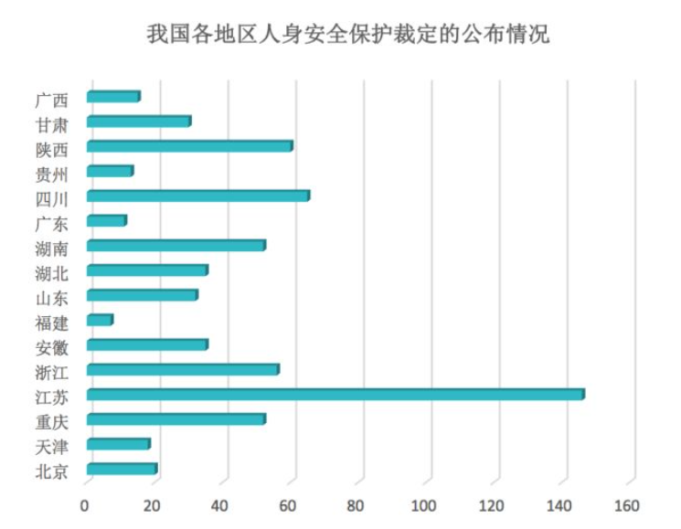从已公布的数据来看,江苏省各法院审理人身安全保护申请的案件居全国首位,四川省以及陕西省各法院审理的案件数量分别次之。此外,河北省、山西省、辽宁省、吉林省、河南省、云南省、青海省、西藏自治区以及宁夏回族自治区共9个省市自治区的法院审理人身安全保护申请的案件数量均低于10件。