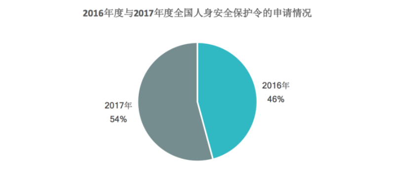 2016年度全国人身安全保护令的申请数量为317件,占比46%;而2017年度全国人身安全保护令的申请数量相比2016年度增加了58件,达375件,占比54%,与2016年相比同比增幅18%。