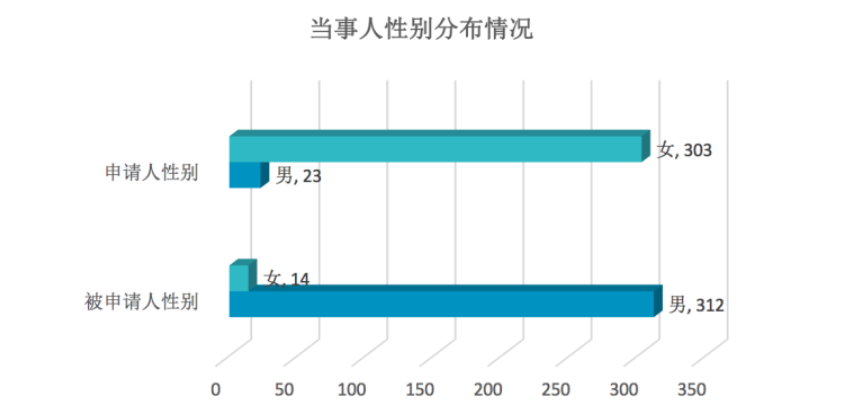 在692件案件中,共326个案件记载了申请人与被申请人的性别。申请人主要为女性,占比93%;被申请人主要为男性,占比96%。