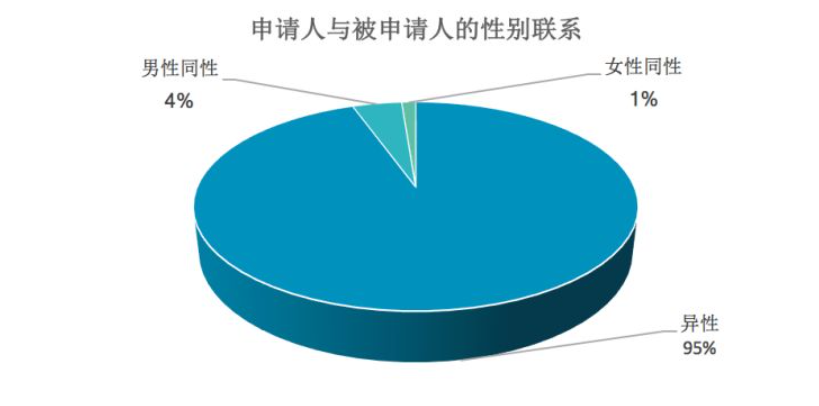 申请人与被申请人的性别关系以异性关系为主,占95%;而发生在同性间的人身安全保护申请案件仅占5%。