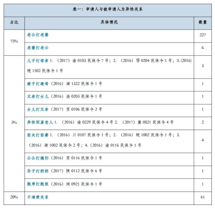 仅就获悉的数据分析发现,我国人身安全保护裁定的当事人双方主要为异性配偶,且涉及离婚纠纷的案件数量较多。