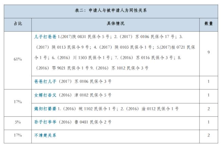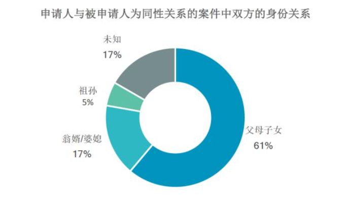 (三)申请人与被申请人为同性关系的案件中,双方大部分系父母子女关系或其他亲属关系。