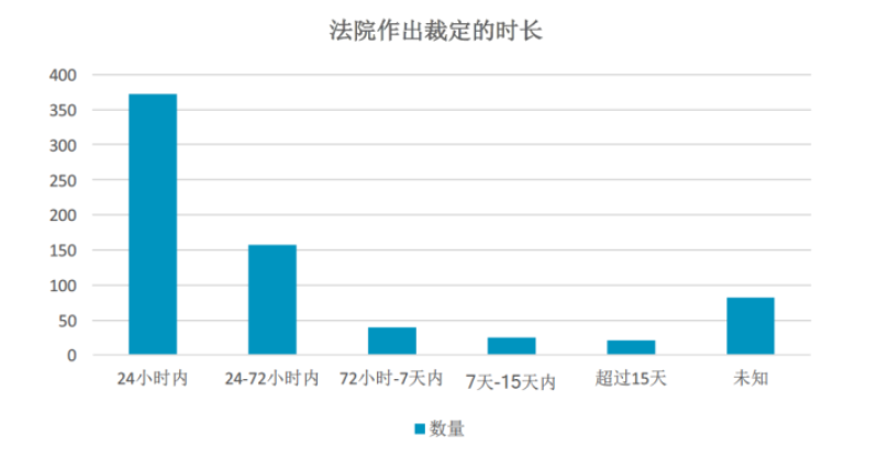 第一,法院出具人身安全保护裁定的周期基本在法定期限内,即在72小时内出具。但在23%的案件中法院存在超过法定期限才出具人身安全保护裁定,甚至存在超过15天才出具裁定的情形。