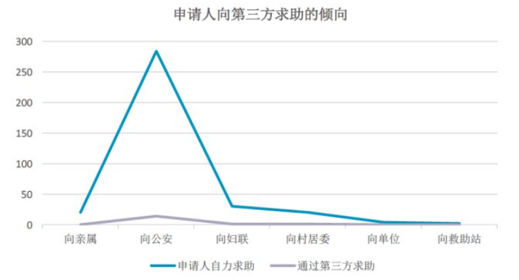在申请人自力向外寻求帮助的案件中,申请人向公安求助的个案最多,共284个,占79%;申请人向妇联求助的个案次之,共30个,占8%;申请人向亲属以及村居委求助的个案数量均为20个,各占6%。