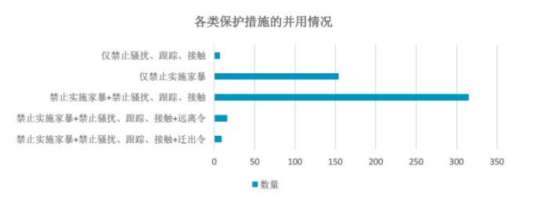 合并采取禁止实施家庭暴力,禁止骚扰、跟踪、接触,迁出令/远离令三类保护措施的案件数量分别为9件以及16件。法院同时采用禁止实施家庭暴力以及禁止骚扰、跟踪、接触这两类保护措施的案件数量最多,共315件,占所有保护令的63%。