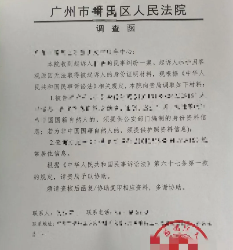 7.以法院开具的《调查函》调取:部分单位不认可法院开具的《补充材料通知》,要求必须由法院发函,但是部分法院不开具诉前律师调查令,可与法院沟通开具《调查函》,根据实践经验,广州市番禺区人民法院可开具该类文书。