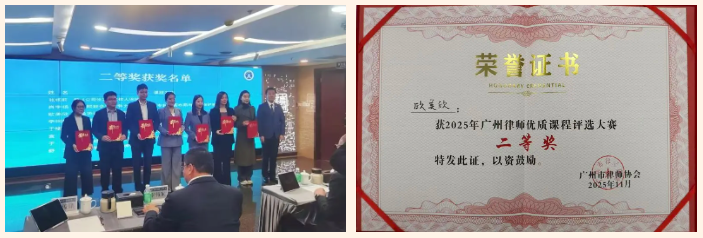 2025年11月27日,由广州市律师协会主办的“2025年广州律师优质课程评选大赛”圆满落幕。广东五美律师事务所李小非律师、欧美欣律师在大赛中斩获佳绩。