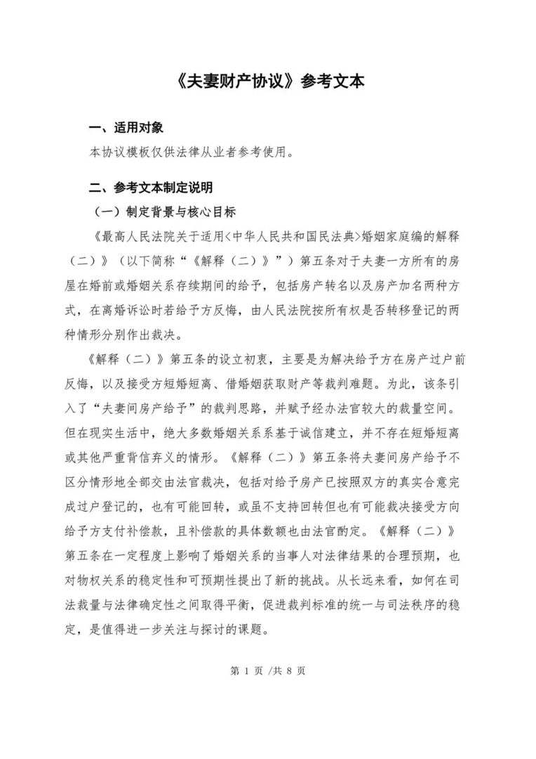 本参考文本系基于夫妻间房产给予相关司法解释的适用背景、裁判逻辑与现实争议的基础,聚焦解决《解释(二)》第五条带来的裁判不确定性问题,帮助婚姻当事人清晰理解房产赠与、加名、过户的法律边界与风险,强化夫妻财产约定的意思自治效力,提升房产处分行为的可预期性与稳定性,降低离婚时房产分割纠纷的发生概率与诉讼风险,对个人权益保障、家庭财产规划均具有积极且重要的实务指导意义。