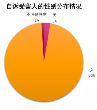 此外,从性别上看,96%的自诉受害人为女性,在所收集的数据中仅有19名男性自诉受害人。(注:关于自诉受害人的年龄,统计时均以2016年作为计算结点)