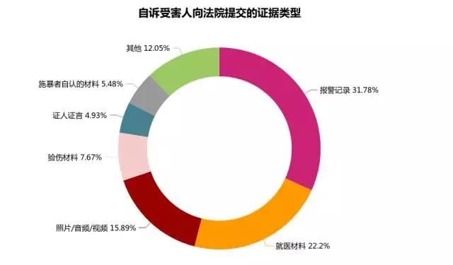 而在23%的案件中,自诉受害人只就对方有家庭暴力行为向法院提交了一类证据。