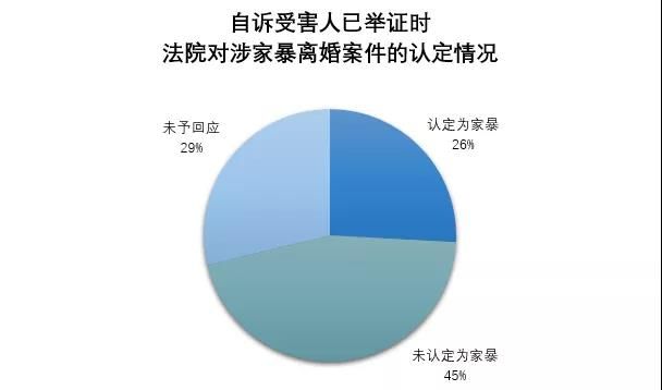 自诉受害人就对方有家庭暴力行为而向法院举证的案件中,法院认定一方有家庭暴力行为的案件占比26%,法院不认定一方有家庭暴力行为的案件占比45%。