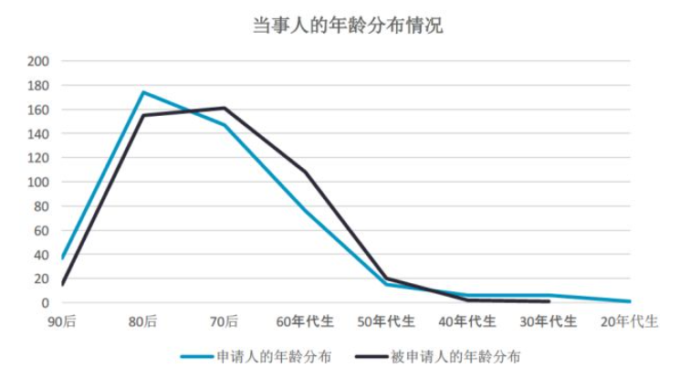 在692件案件中,共462个案件记载了申请人与被申请人的年龄。申请人与被申请人以70后、80后为主,其中申请人中80后最多,而被申请人中70后最多。
