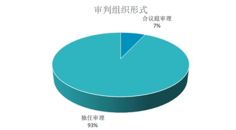 在692件案件中,共644件案件的审判组织形式为独任审理,占93%;共48件案件的审判组织形式为合议庭审理,占7%。