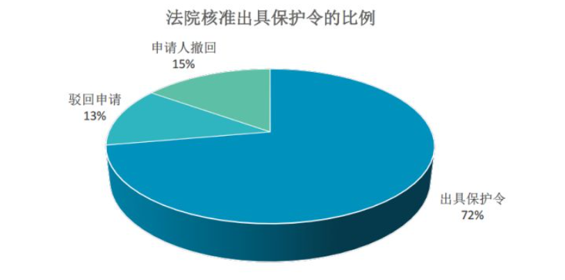 在692件案件中,法院出具人身安全保护裁定的案件共500件,占72%;驳回申请的案件共87件,占13%;申请人撤回申请的案件共105件,占15%。