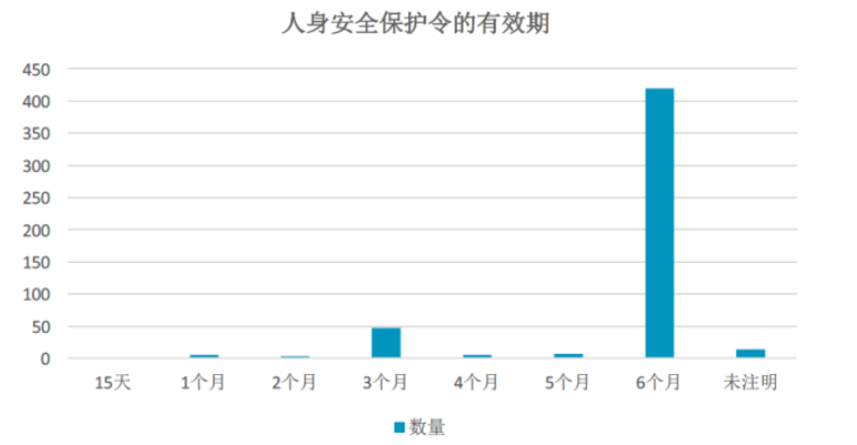 第四,人身安全保护令的保护周期基本为6个月,但也有例外情况,最短的保护期为15天,保护期为三个月的保护令数量位居第二。