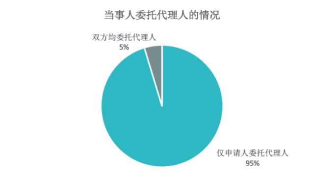 在692件案件中,仅129件案件中的申请人/被申请人委托了代理人,仅占全部案件的19%。其中仅申请人委托代理人的案件共123件,占95%;双方均委托代理人的案件共6件,占5%。