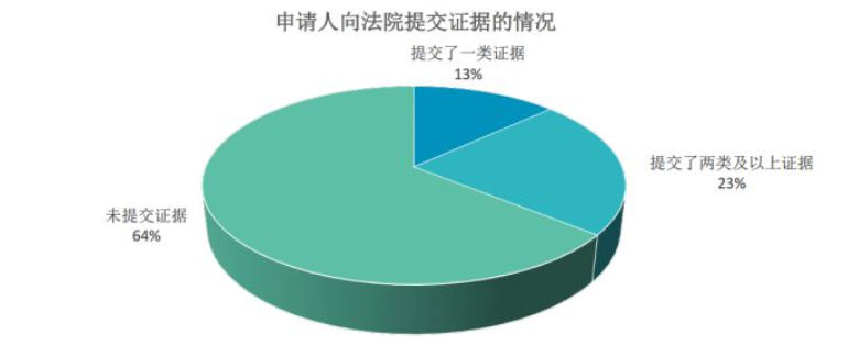 在692件案件中,共248位申请人向法院提交了证据以证明被申请人实施了家庭暴力。其中,申请人仅向法院提交了一类证据的案件共91件,占13%;申请人向法院提交了两类及以上证据的案件共157件,占23%;申请人未向法院提交任何证据的案件共444件,占64%。
