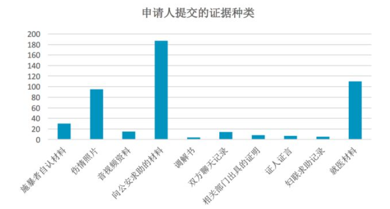 在248件申请人已向法院提交证据的案件中,申请人向法院提交其曾向公安求助的资料的案件共187件,占75%;申请人向法院提交其因家暴到医院就医的材料的案件共110件,占44%。此外,申请人向法院提交伤情照片用以证明其曾遭受家暴的案件共95件,占38%。
