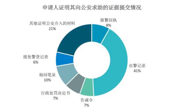 在187件申请人向法院提交了材料以证明其曾向公安求助的案件中,将警方的出警记录作为证据提交的比例最高,为41%。而申请人向法院提交报警回执、接处警登记表、询问笔录、行政处罚决定书以及告诫令等证据的案件占比均在10%以内。