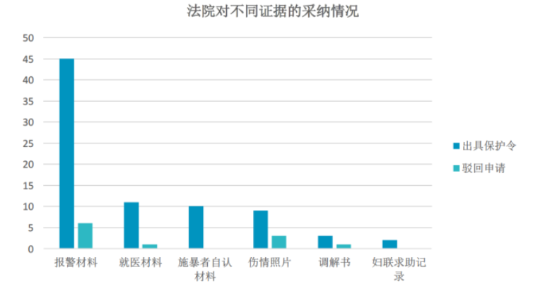 法院对于证据的采纳情况也有明显特征,对于施暴者的自认材料以及妇联求助材料法院的采纳比例是100%,对于就医材料以及报警材料的采纳比例也高于50%。