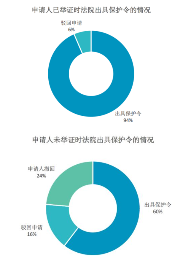 通过对比申请人举证与否时法院出具人身安全保护令的情况可见,在申请人已向法院举证的前提下法院出具人身安全保护令的可能性明显高于申请人未举证的情况。值得注意的是,在申请人未向法院举证的情况下,申请人向法院撤回申请的比例达24%。