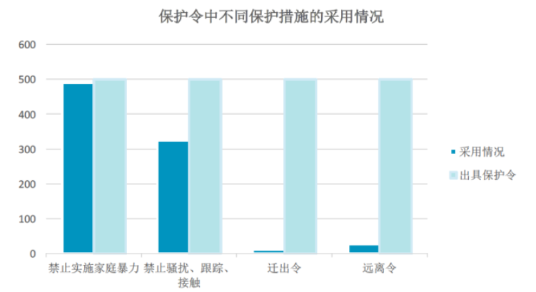 在500件法院出具保护令的案件中,保护措施以禁止实施家庭暴力以及禁止骚扰、跟踪、接触这两类保护措施为主。