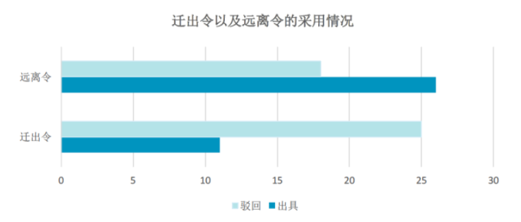 在500件法院出具保护令的案件中,保护措施中包含远离令的案件仅26件,驳回远离令申请的案件共18件,驳回率达41%。保护措施中包含迁出令的案件仅11件,驳回迁出令申请的案件共25件,驳回率达69%。