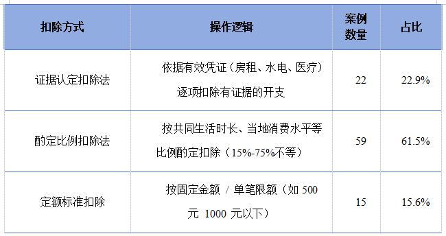 1.证据认定扣除法:适用于第三者提交了充分、具体的消费凭证的情形,法院会对租房合同、水电缴费凭证、医疗费票据等有效证据逐项审查,将有证据佐证的共同生活开支从应返还总额中直接扣除。该方式认定结果最精确,但对第三者的举证能力要求最高,在部分支持案例中占比22.9%。