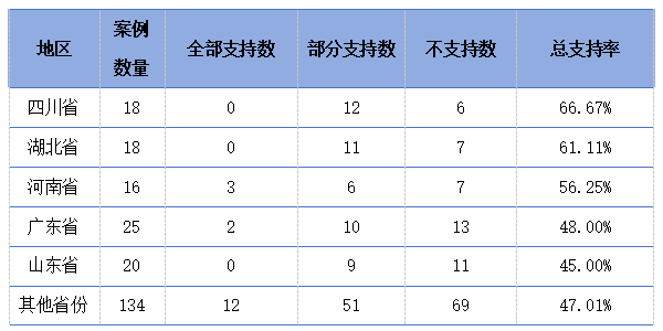 不同省份的法院对共同生活抗辩的支持率存在一定差异,为保证统计结果具有参考性,本次分析仅将样本量较大的省份单独列明,样本数少于15的省份统一归入“其他省份”合并统计。数据分析结果显示四川省、湖北省的整体支持率较高,分别为66.67%、61.11%,河南省、广东省、山东省及其他省份的支持率相对较低,在45%-56%之间。这一差异源于不同地区的司法裁判理念,部分地区更注重尊重客观事实,部分地区则更强调公序良俗的维护,但整体裁判尺度并未出现根本性分歧。