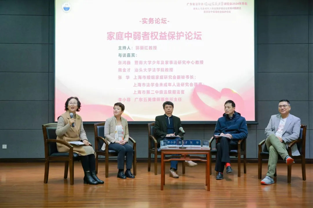 2024年12月14日,广东省法学会婚姻家庭法学研究会2024年会“老年人与未成年人权益保护理论与实践问题研讨”暨家庭中弱者权益保护论坛在广东工业大学召开,广东五美律师事务所李小非律师、卢俊峰律师、欧美欣律师、关虹敏律师、梅杰律师以及郭欢律师出席会议。