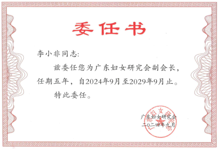 李小非律师长期关注妇女儿童权益保护、青少年健康成长等社会问题,积极投身维护妇女儿童权益的法律服务工作,此次当选广东妇女研究会副会长,是对其工作的高度认可。今后,将积极履职,聚焦妇女儿童健康发展、男女平等、法律保护等方面,充分发挥专业优势,为推动妇女儿童事业高质量发展助力。