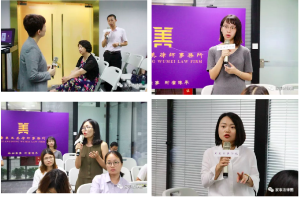 李主任在讲座中还跟嘉宾们分享了五美律师办理家事案件的独特方式,在处理家事案件中五美律师为当事人特别设置了“庭前辅导”环节。李律师分享到:在家事案件中当事人必须到庭而且起到关键作用,那么当事人的表现、当事人的情绪势必影响案件的审理甚至影响律师的发挥,所以对当事人进行庭前辅导,让其提前知晓审判流程、辅导当事人缓解紧张情绪、对庭审中顺畅、真实地将案件实事呈现出来极其重要。